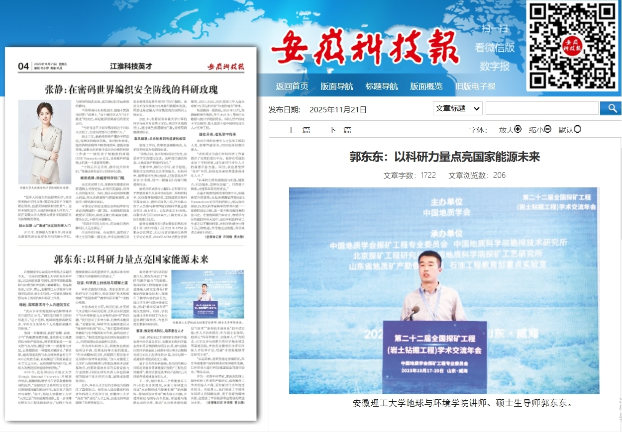 近日,安徽省科学技术协会与《安徽科技报》联合聚焦巨乳做爱 青年教师郭东东在非常规能源勘探与开发领域的科研成果,并以《郭东东:以科研力量点亮国家能源未来》为题进行宣传报道。